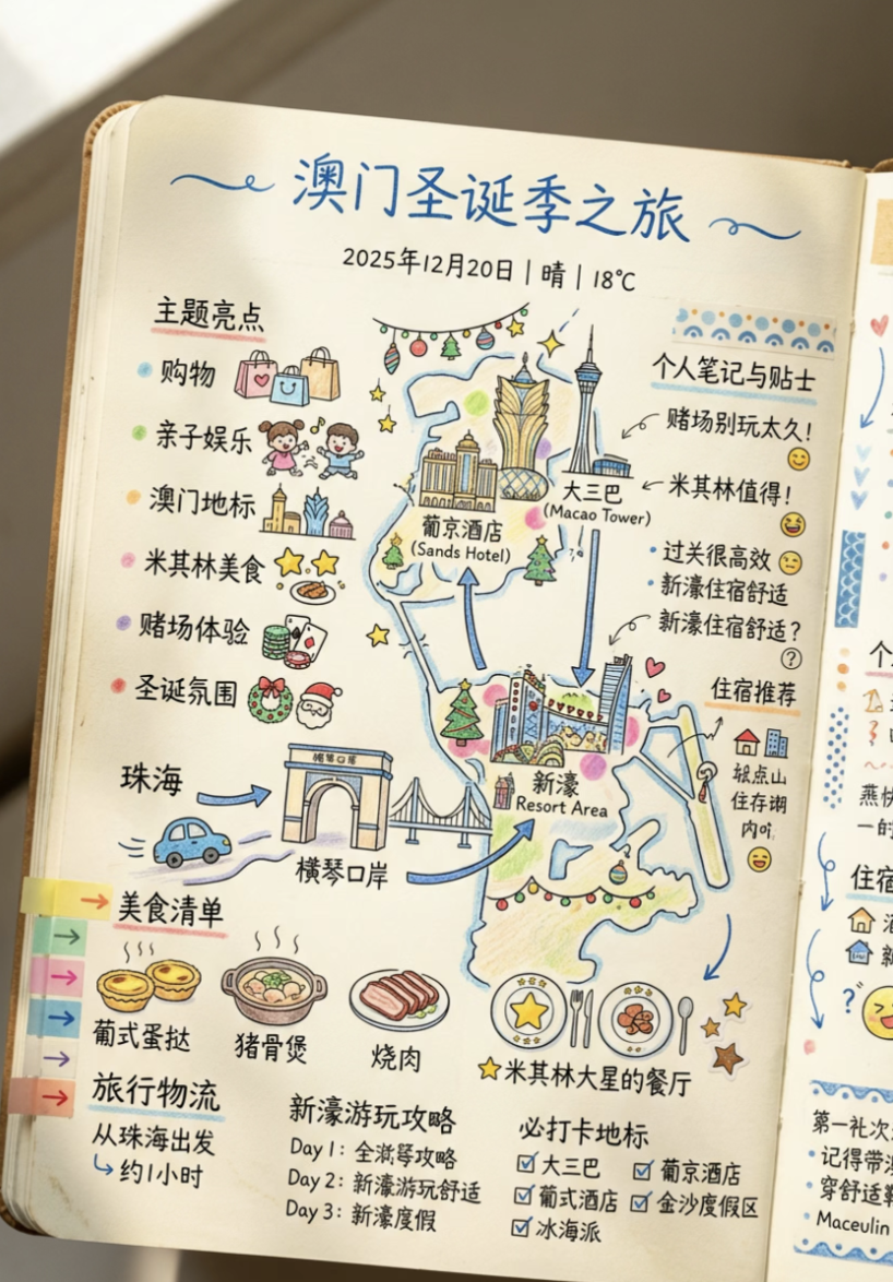 帮我制作XXX旅游路书】记录当下的天气、时间,旅游的 主题是[.] 呈现要求:4:3比例的8k高清冬主现汁笔记本内页,左右页完整呈现出手绘路图、笔记和攻略、蓝 色万宝龙钢笔流畅书写与H2B铅笔细腻手绘线条交织呈现。 彩色铅笔手绘、采用 Ujisato Usui蜡笔小新式作品的可爱幽默风风格绘制 landmark、special food及路线图,形成层次丰富的混合绘画风格,重要部分用彩色标记圈点突出,个人见解和疑问以不同钢笔笔迹的小字穿插其中展现笔记记录者幽默风趣的分享精神。留白处贴1-2张 Instax mini风景照片体现大理慢时光。柔和的自然光从左上角洒向具备质感的羊皮纸纸 面,钢笔的墨蓝色与铅笔的颗粒感在米白色纸张上形成温润的冷暖对比,清晨时光的静谧氛围让手写字体显得格外清晰优雅。优雅的 Signatura Monoline英文字体与清新自然的中文即兴手写体相工呼应,展现隽水消新的魅力。钢笔字的力度与铅笔线条的柔软质感形成有趣的视觉层次。清新整齐的排版布局中巧妙融入细致的小巧思,如页边装饰性图案、彩色便签条、表情符号和手绘箭头指引,体现出创作者对细节的用心与对美好事物分享的热情。