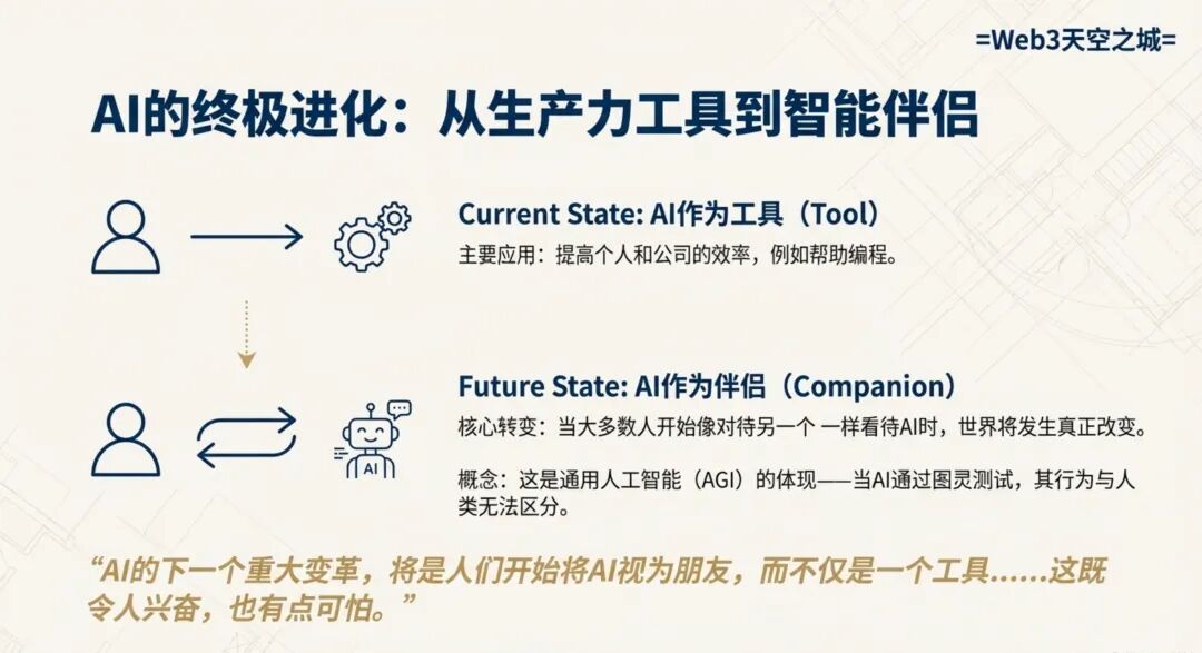 所以,我认为AI的下一个重大变革,将是人们开始将AI视为朋友,而不仅仅是一个工具。你现在看,AI更像是一个工具,我们都希望利用它来提高我们自己、我们公司的效率。AI已经在帮助我们编程,所以我们不需要那么多软件工程师。但是,当AI成为某种陪伴时——当大多数人开始像对待另一个人一样看待AI时——那将真正地改变世界。它将改变行为。有时候想到这一点会让人感到恐惧。但我认为这种情况正在发生。