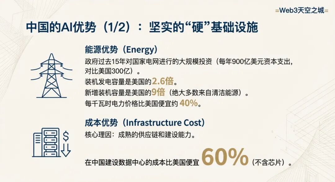 其次是算力基础设施的成本优势。在中国建设数据中心的成本比美国低约60%。这种结构性的成本差异,将直接转化为AI服务价格的竞争力。