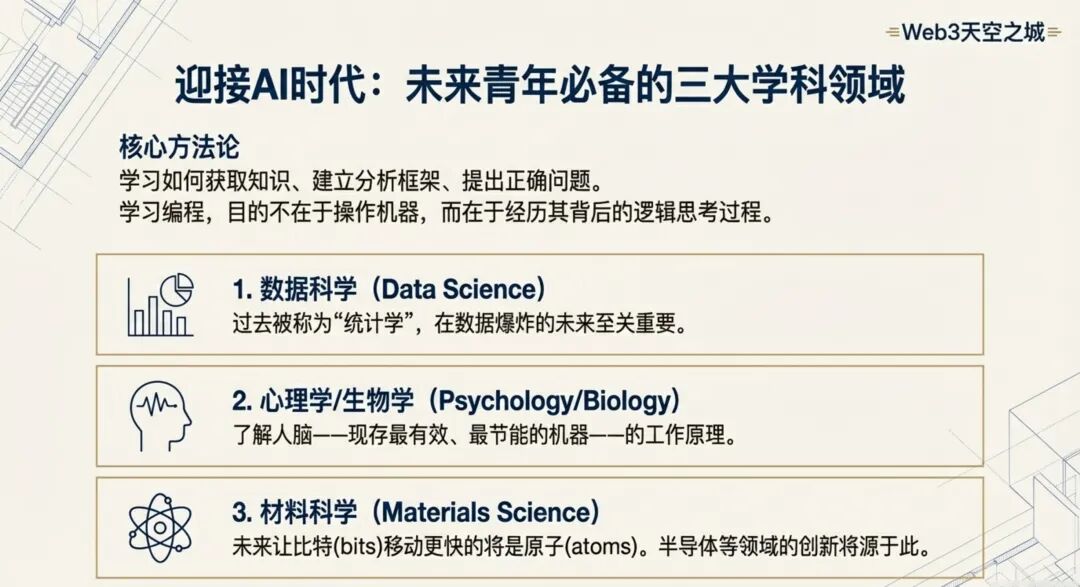 • • 给青年的建议:应掌握获取知识的方法、分析框架及编程逻辑;推荐关注数据科学、心理学/生物学(理解大脑)以及材料科学(原子层面的创新)。