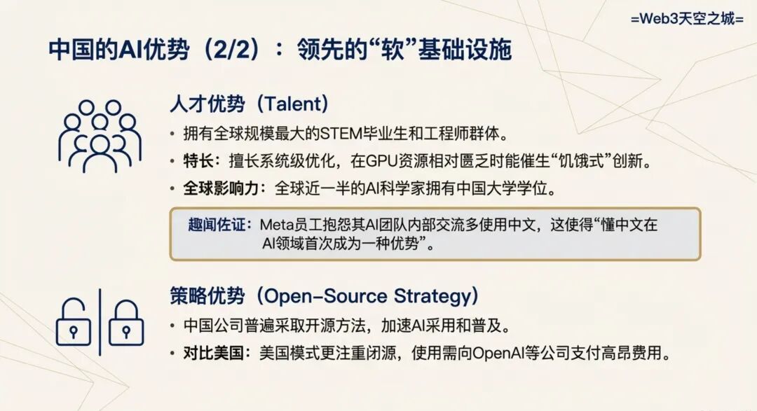 他提出中国AI的四大结构优势:能源低价、设施成本低、工程人才红利与开源策略。这些因素彼此补位,形成飞轮效应: