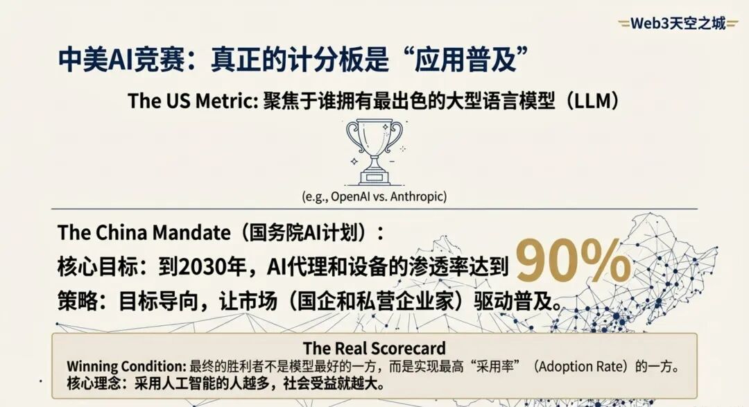 “中美AI竞赛的记分牌不应仅仅看谁的大模型更强,而应看谁的采用率(Adoption Rate)更高。采用人工智能的人越多,社会受益就越大。”