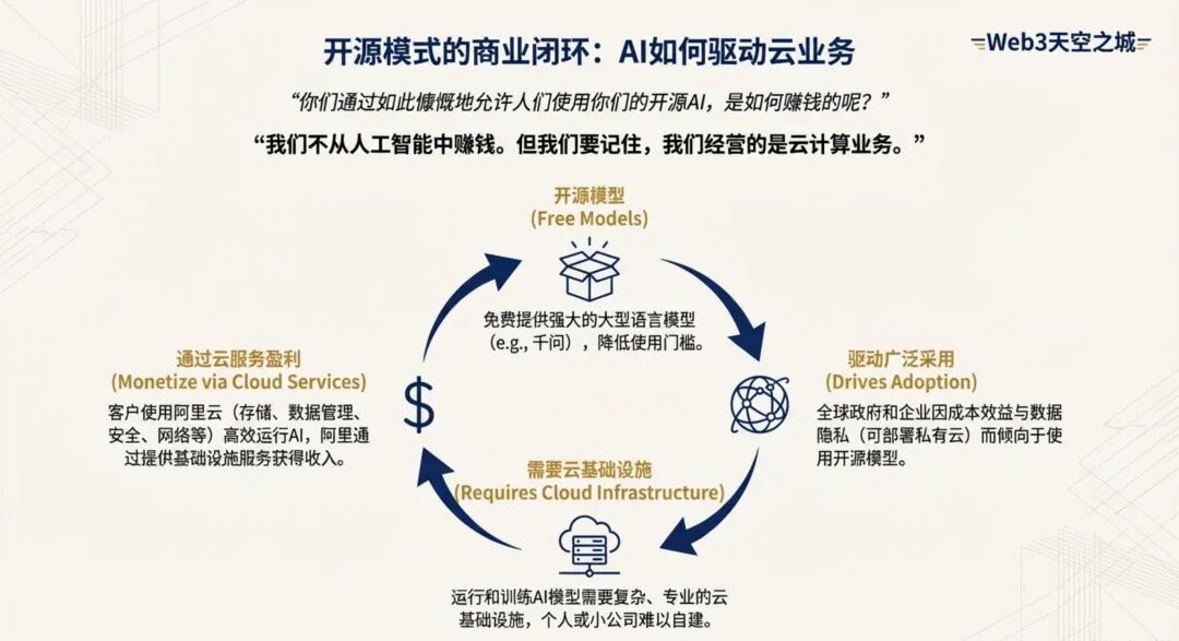 “我们不从模型本身赚钱,我们通过云基础设施盈利。” 蔡崇信一语道破了阿里巴巴的AI战略。通过将高性能模型开源,阿里降低了全社会使用AI的门槛。对于中东、东南亚等希望拥有“主权AI”但缺乏研发能力的国家和地区而言,基于开源模型进行微调是比直接购买OpenAI API更具吸引力的选择。