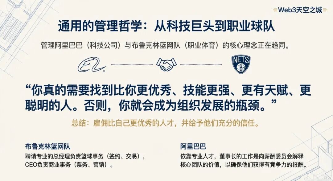 蔡崇信坦言,管理一家像阿里巴巴这样的巨头,核心在于“雇佣比自己更优秀的人才”。无论是在商业帝国还是在他拥有的布鲁克林篮网队(Brooklyn Nets),领导者的职责是制定愿景并给予专业人士充分的信任。