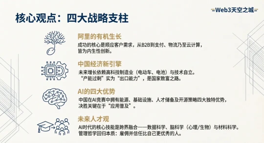 在这个充满不确定性的时代,蔡崇信的这番对话不仅是对阿里巴巴战略的剖析,更是一份关于中国如何在技术封锁中突围、在变革中寻找新增长点的深度观察报告。正如陈爱德华教授在结语中所总结的:“国家战略的定力、能源基建的远见、庞大的工程师红利以及开放的生态系统,这四者构成了中国AI发展的独特飞轮。”