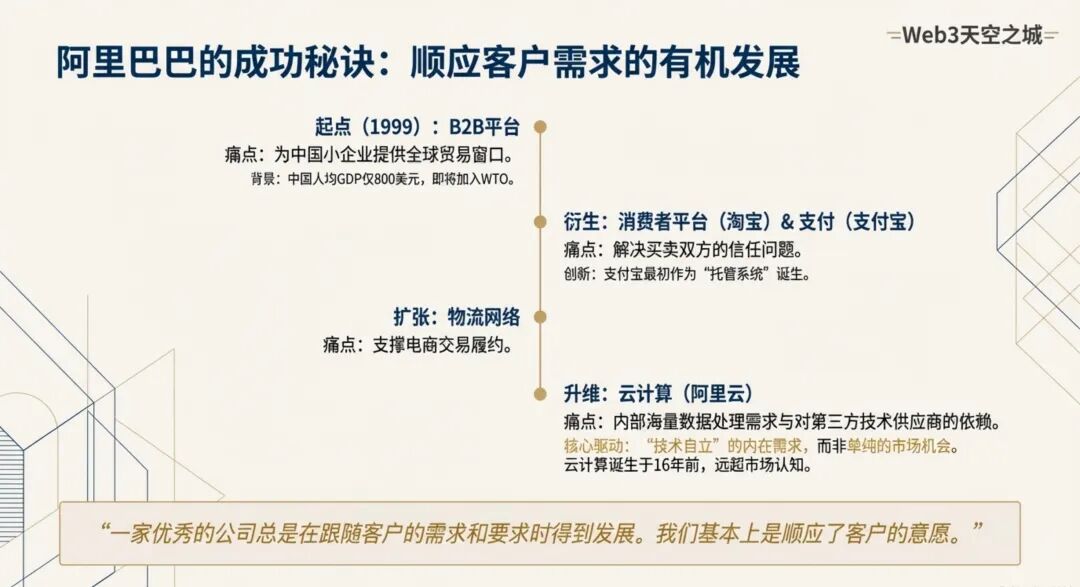 回顾阿里巴巴26年的发展史,蔡崇信将其总结为一种“有机的进化”。从最初帮助中小企业出口的B2B平台,到解决信任问题的支付宝,再到因内部数据处理需求而诞生的阿里云,阿里的每一步转型都是为了解决具体的客户痛点或自身瓶颈。