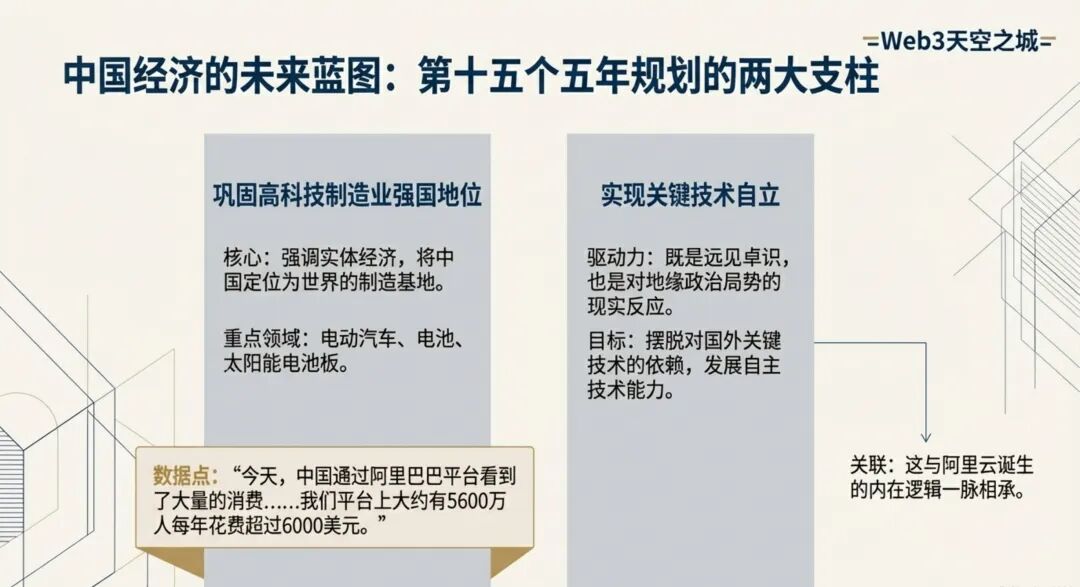 面对关于中国经济放缓的讨论,蔡崇信展现出了基于历史纵深的乐观。他指出,中国经济的韧性在于其明确的“双引擎”战略:保持制造业强国地位与实现技术自立