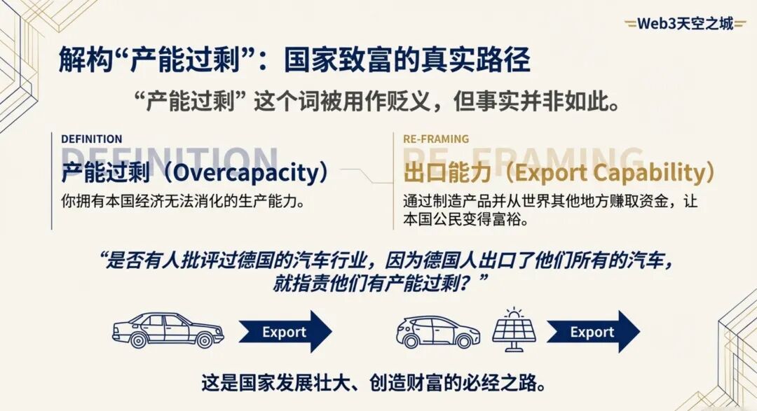 “所谓‘产能过剩’(Overcapacity),本质上是一个国家将本国无法消化的生产能力转化为出口的能力。这不应是一个贬义词,而是一个国家致富的途径。”